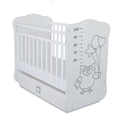 белая детская кроватка от известного российского производителя SKV-company с практичным и надежным механизмом качания поперечный маятник и гравировкой совы, выполненная из массива березы, ЛДСП и МДФ с гравировкой совы с ростомером, с использованием высококачественных нетоксичных лакокрасочных материалов на водной основе. Оснащена закрытым выдвижным ящиком для хранения детских принадлежностей