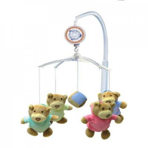 Пластмассовая каруселька с плюшевыми игрушками (мишки в штанишках). Музыкальная карусель скрасит вашему малышу время проведенное в кроватке, а успокаивающая мелодия поможет ребенку заснуть. Разноцветные игрушки также могут быть использованы отдельно от карусели.