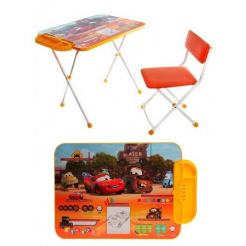 Складной комплект детской мебели Д2Т Disney 2 "Тачки". В комплект входит стол, съемный пенал и стул с мягким сиденьем. Каркас изготовлен из металла, цвет окраски оранжевый. На ножках установлены пластмассовые наконечники. Рекомендуемый возраст от 3 до 7 лет.