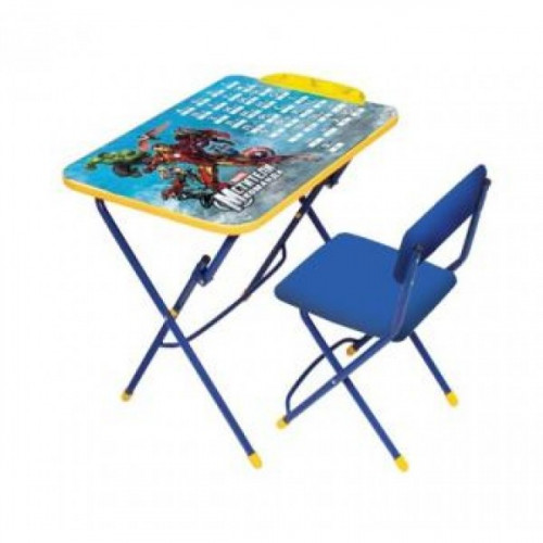 Складной комплект детской мебели Д3А "Мстители". В комплект входит стол, съемный пенал и стул с мягким сиденьем. Каркас изготовлен из металла, цвет окраски синий. На ножках установлены пластмассовые наконечники. Рекомендуемый возраст от 3 до 7 лет.