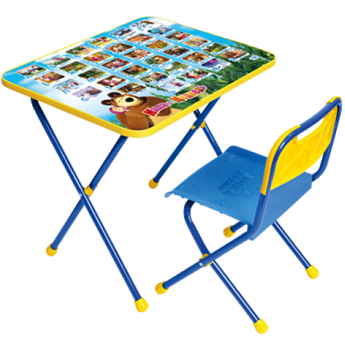 Складной комплект детской мебели КП "Азбука 1: Маша и медведь". Комплект складной. Подходит для кормления, игр и обучения. Поверхность столешницы ламинированная с нанесением ярких познавательных рисунков. На поверхности стола можно рисовать маркером на водной основе.Сиденье стула пластиковое, легко моющееся.