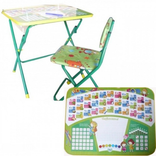 Складной комплект детской мебели КУ1 "Первоклашка", на зеленом фоне. В комплект входит стол и стул с мягким сиденьем. Каркас изготовлен из металла, цвет окраски зеленый. Каркас изготовлен из металла, цвет окраски синий. Комплект складной. Подходит для кормления, игр и обучения. Поверхность столешницы ламинированная с нанесением ярких познавательных рисунков. На поверхности стола можно рисовать маркером на водной основе.