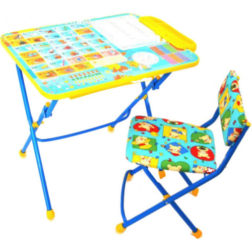 Складной комплект детской мебели КУ2 "Первоклашка, осень.". В комплект входит стол, пенал и стул с мягким сиденьем. Каркас изготовлен из металла, цвет окраски синий. Каркас изготовлен из металла, цвет окраски синий. Комплект складной. Подходит для кормления, игр и обучения. Поверхность столешницы ламинированная с нанесением ярких познавательных рисунков. На поверхности стола можно рисовать маркером на водной основе.