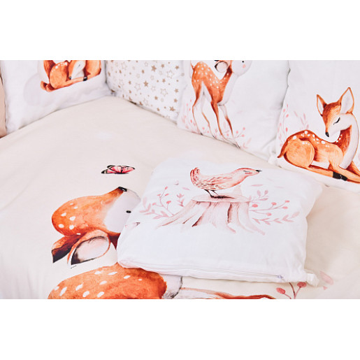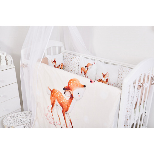 Сказочный и уютный комплект Оленята по-настоящему передает свою идею лесной прогулки. Добрые зверюшки станут хорошими друзьями вашему малышу. Красочные принты, нежная расцветка и их удачное сочетание создали этот комплект воедино. Мягкие подушечки смотрятся миловидно, а каждая из них индивидуальна, в дальнейшем, когда малышу уже не понадобятся бортики, подушечки можно будет использовать по назначению: разложить на кроватке, диванчике или кресле, что придаст гармоничность и единый стиль интерьеру.