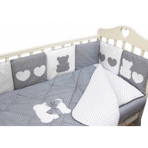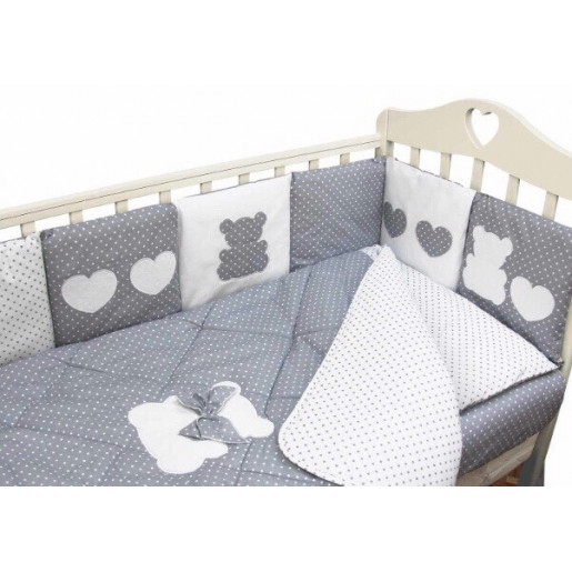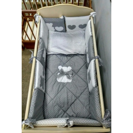 Комплект постельного белья в детскую кроватку " Мой любимый мишка" состоит из 5-ти предметов предназначен как для стандартной кроватки размером 120×60 см, так и овальной кроватки. Комплект в кроватку новорожденного абсолютно безопасен для здоровья, выполнен с использованием изящного сочетания основной ткани и ткани-компаньона с принтом горох. Кроме того, борт и одеяло украшены аппликацией в виде мишек и сердечек. Изюминкой этого постельного сета являются сочетание бортиков в форме подушек и шоколадок.