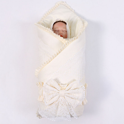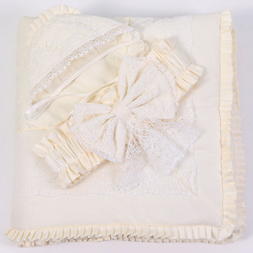 Конверт-одеяло Полли идеально подойдет как на выписку - нарядное, декорированное кружевом и нежной вышивкой, так и для повседневного пользования. Подходит на осень, весну и зиму. Большое полноценное одеяло, выполнено из 100% хлопка. Конверт крепится на липучке сбоку, который дополнительно фиксируется бантом, который находится в комплекте. Нарядная шапочка на завязках.Характеристика