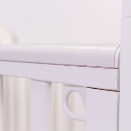 Верхние перекладины боковых бортиков защищены силиконовыми накладками (грызунки) для защиты кроватки от острых зубок малыша.