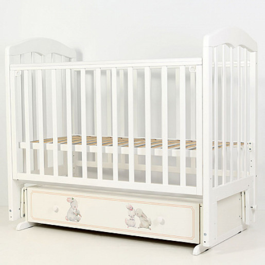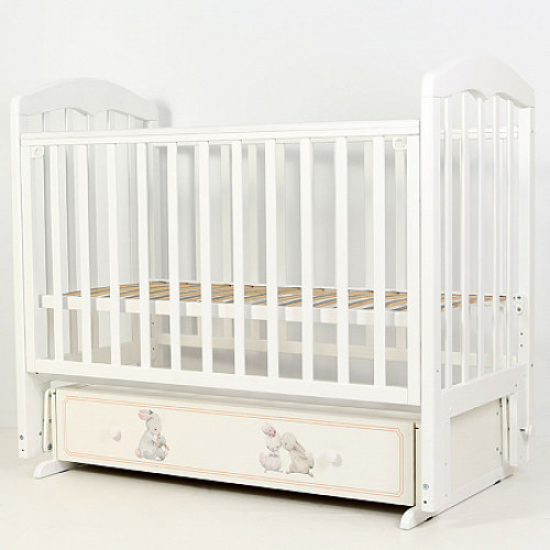 Изящный дизайн, плавные линии, умеренная цена и высокое качество обработки дерева- вот главное преимущество этой модели! Фасад ящика кроватки украшает принт зайчика. Для удобства наклона к малышу, верхняя планка переднего ограждения опускается нажатием кнопки. Ортопедические свойства ложа обеспечивают гнутые рейки "латофлекс". Для защиты зубок ребенка и поверхности ограждения, на верхние планки кроватки крепятся специальные накладки "грызунки". Пластиковая маятниковая опора подшипникового типа выдерживает нагрузку до 291 кг, а также обеспечивает плавность качания. Маятниковый механизм поперечного и продольного качания. Вкручивающийся стопор маятникого механизма обеспечивает надежную и безопасную фиксацию. Вместительный выкатной ящик закрытого типа защищает вещи от попадания пыли. Надежные опоры основания придают конструкции устойчивость и предотвращают контакт ящика с полом.