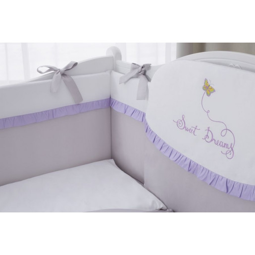 Изысканный, оригинальный, трогательный – новый эксклюзивный комплект «Sweet Dreams» от Perina. Утонченный узор - россыпь словно живых бабочек на нежном пастельном фоне. Изящные рюши, фактурная вышивка, чарующие переливы элитного сатина. Подарите вашему малышу этот сладкий сон.