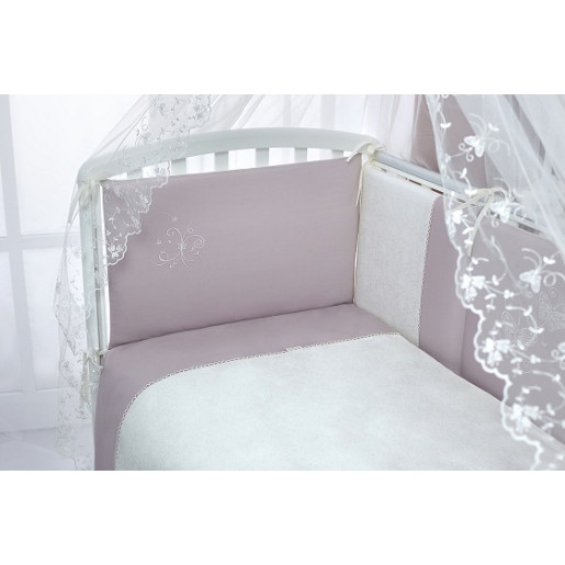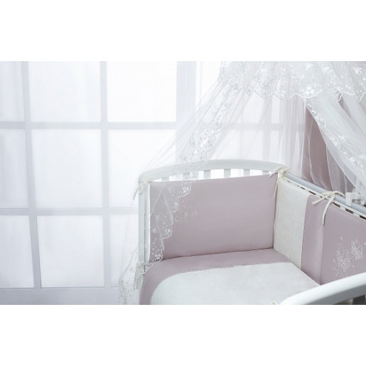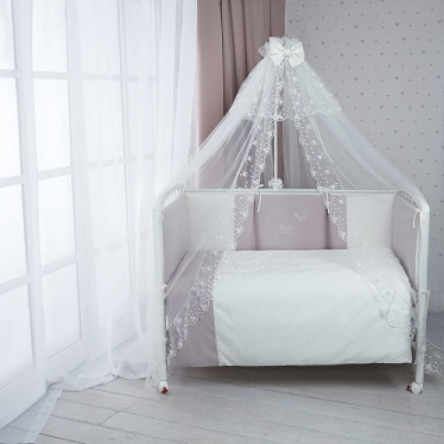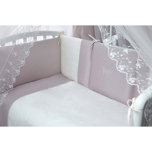 Шикарный комплект из элитных материалов, который очарует вас и вашего малыша. Модель «Амели» – это нежность шелка, изящество кружев, гладкость высококачественного хлопкового сатина и изумительная красота летящих бабочек – шелковых аппликаций, придающих белью сказочный вид. Бампер из четырех частей украшен кружевом, простыня – декоративными рюшами. Балдахин из вуали создаст волшебную атмосферу уюта в детской спальне. Одеяло и подушка – с натуральным наполнителем из эвкалиптового волокна, столь же нежного и легкого, как шелк. Эвкалиптовое волокно легко выдерживает многочисленные машинные стирки и не теряет после них объем и свои уникальные антиаллергенные и антибактериальные свойства.