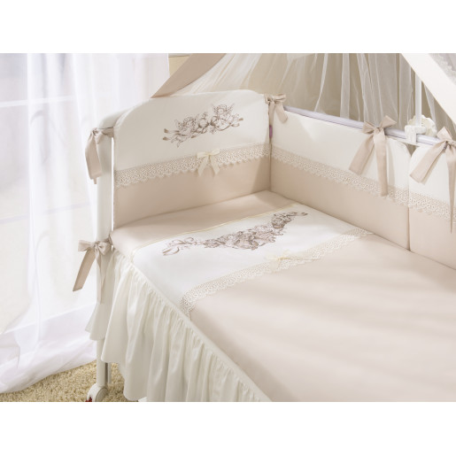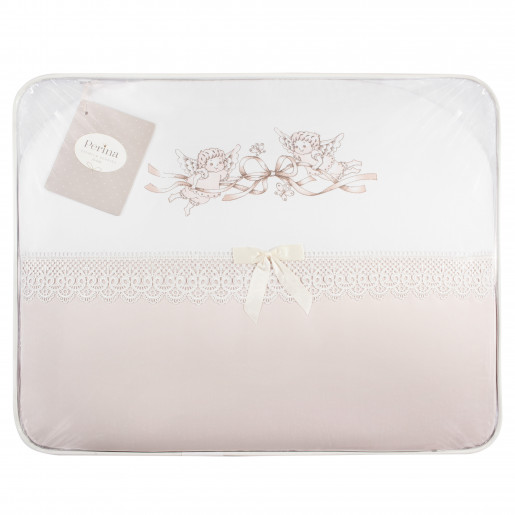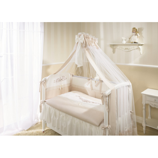 Разработанная французским дизайнером Jean Paul Lautier, модель «Эстель» погружает в эпоху Ренессанса. Пастельные тона, изящное кружево, декоративные рюши, тематический принт – ангелы в розах, ленточки, бабочки, техника гравюры – каждая деталь создает атмосферу легкости и роскоши. Вместе с тем не остается в стороне практичность – бампер из шести частей дает возможность разнообразных вариантов использования. Одеяло и подушка – с наполнителем из эвкалиптового волокна, сравнимого по мягкости с шелком. Этот природный наполнитель обеспечивает фантастический комфорт и подходит всем без исключения, включая новорожденных. Подушки и одеяла из эвкалипта надолго сохраняют объем и форму, причем это свойство не теряется даже после многочисленных стирок.