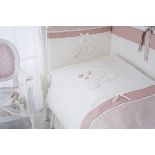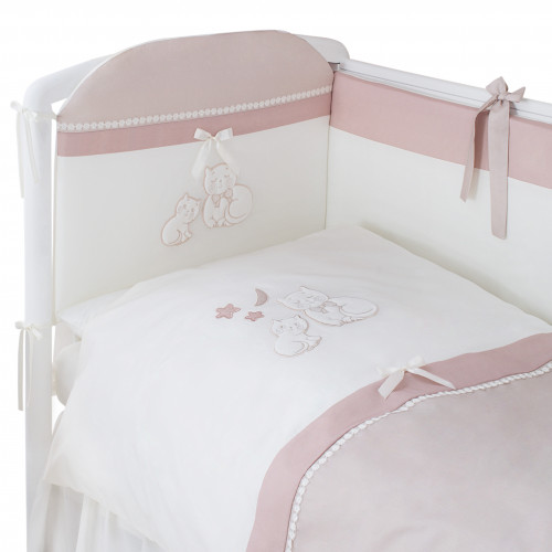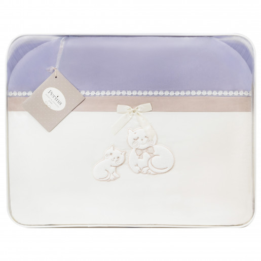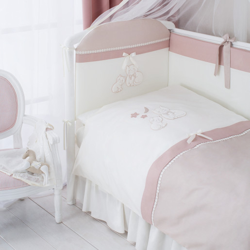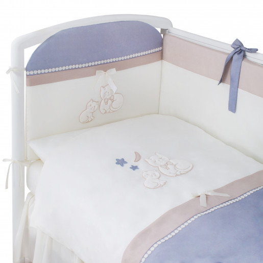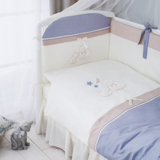 Модель «Котята» - это благородные оттенки, изящные детали, воздушные кружева и нежный элитный сатин с эффектом шелка. Каждое движение подарит вашем малышу приятные ощущения, сравнимые только с ласковым маминым прикосновением. Пушистые котята - натуральные аппликации из велюра - успокоят своей мягкостью перед сном, а днем станут прекрасным развлечением для маленького первооткрывателя.