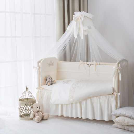 Комплект постельного белья «Версаль» создан для новорожденных принцев и принцесс. Истинно французская, изысканная роскошь сатин-жаккарда (невероятно мягкой ткани с рельефным узором из высококачественного хлопка и бамбукового волокна) – в сочетании с утонченными кружевами, изящной вышивкой, цветом шампань станет подлинным украшением детской комнаты и создаст особый уют и комфорт для малыша. Бампер из шести частей дает возможность разнообразных вариантов использования. Одеяло и подушка – с наполнителем из эвкалиптового волокна, природного материала, который сравним по мягкости с шелком и подходит всем без исключения, включая новорожденных. Подушки и одеяла из эвкалипта не теряют объема и формы даже после многочисленных стирок.